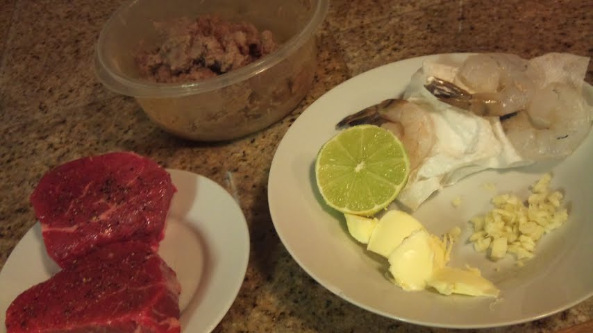- Once your meat has been flipped, heat the "1/4C Skillet" over medium heat and toss in the rest of the garlic and after a few seconds, add the prawns. Once pink on one side, flip, and cook until done (about 2-3 minutes per side). OR prepare the re-fried beans as directed on the can (I'll try to make up a delicious recipe for re-fried beans in the future)...