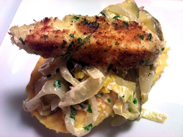 - In 3 separate bowls, put the flour, eggs, and panko crumbs. Mix the juice of one lemon into the eggs and the zest into the panko crumbs with the finely chopped parsley - season with salt and pepper to taste.
