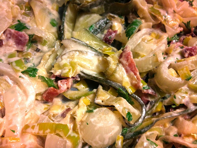 - By now your bacon should be cooked and set aside. In the "bacon pan", over medium heat, toss in the onions, and leeks. After 2-3 minutes, add the zucchini and turn up the heat to medium-high. Cook a further 8-10 minutes, stirring occasionally until the water from the zucchini has cooked out. Squeeze the juice from a lemon in and stir well.
