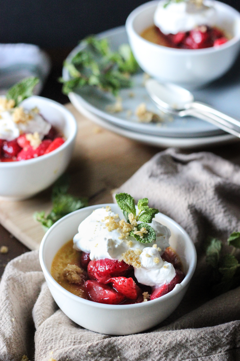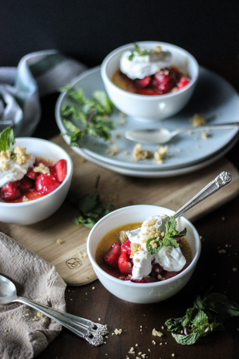 - Assemble! Pull the ramekins of pudding from the fridge and gently top with fresh whipped cream, bourbon macerated strawberries, a sprinkling of cornbread crumble, and a sprig of fresh mint.
