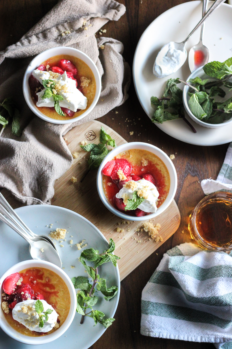 Vanilla Pudding with Bourbon Macerated Strawberries & Cornbread Crumble