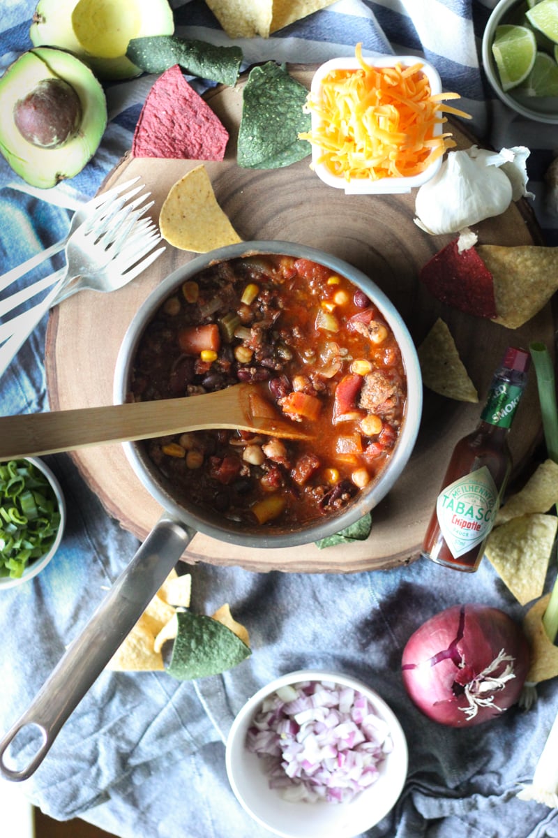 Loaded with fresh veggies, spiced protein, and spiked with dark beer, this recipe is one of the best chili recipes you will ever make. You probably have all the ingredients in your fridge already, too. And it comes together in an hour. Though I won’t lie - dishing up seconds the next day (or 3) makes it even better. Garnish to your preference, though I like a healthy dose of sour cream, diced red onion, sliced avocado, cheddar cheese, green onion, hot sauce, some tortilla chips, and more beer. But that’s me.